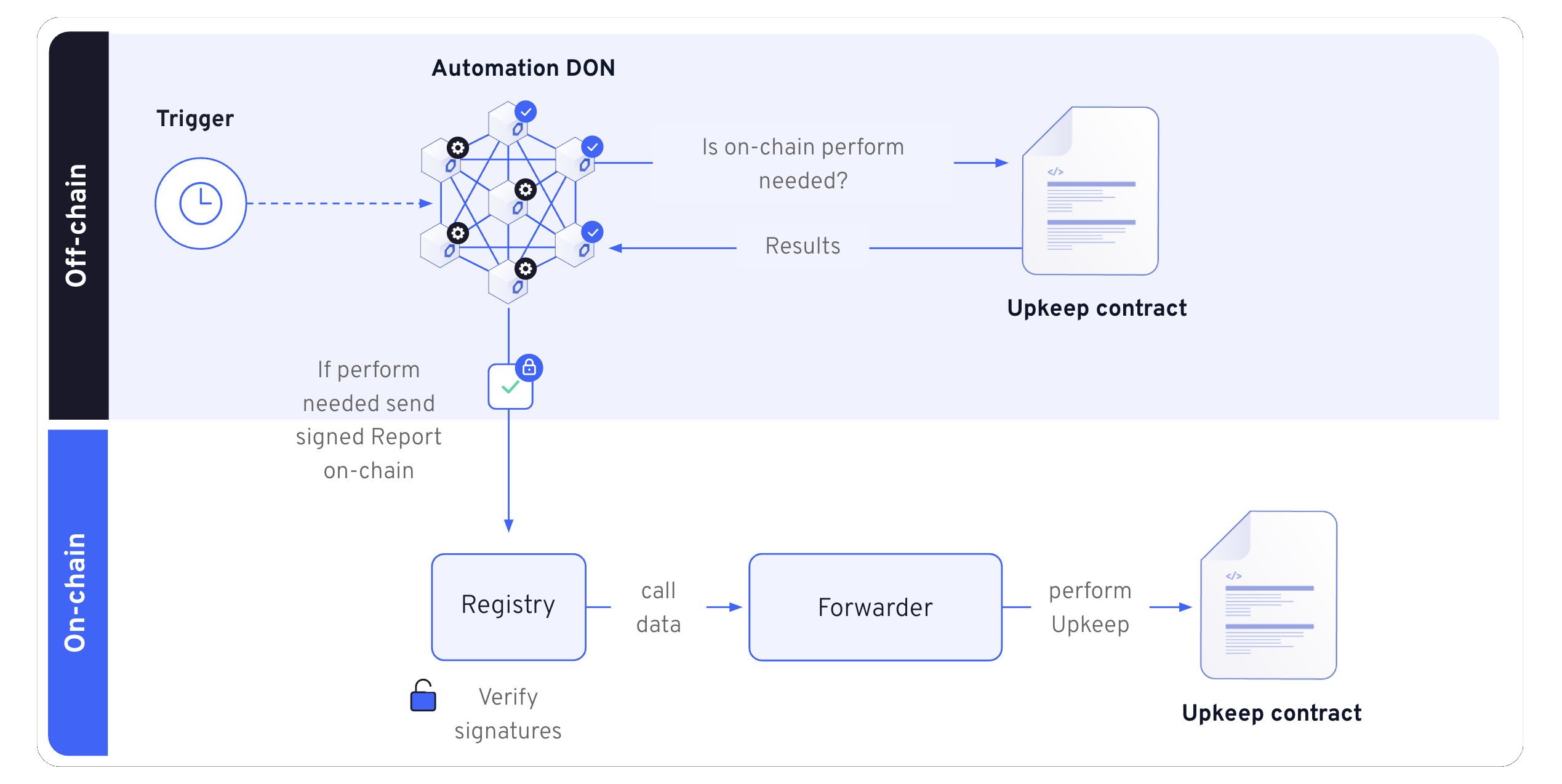 Using Chainlink's OCR3 protocol, nodes then get consensus on which upkeeps to perform and sign a report. The signed report contains the performData that will be executed onchain and the report is validated on the Registry before execution to provide cryptographic guarantees. The network has built-in redundancy and will still perform your upkeep even if some nodes are down.