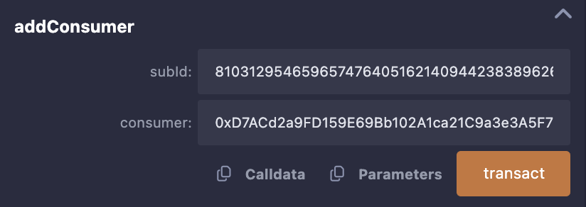 2. Click addConsumer and fill in the _subid with your subscription ID and _consumer with your deployed consumer contract address.