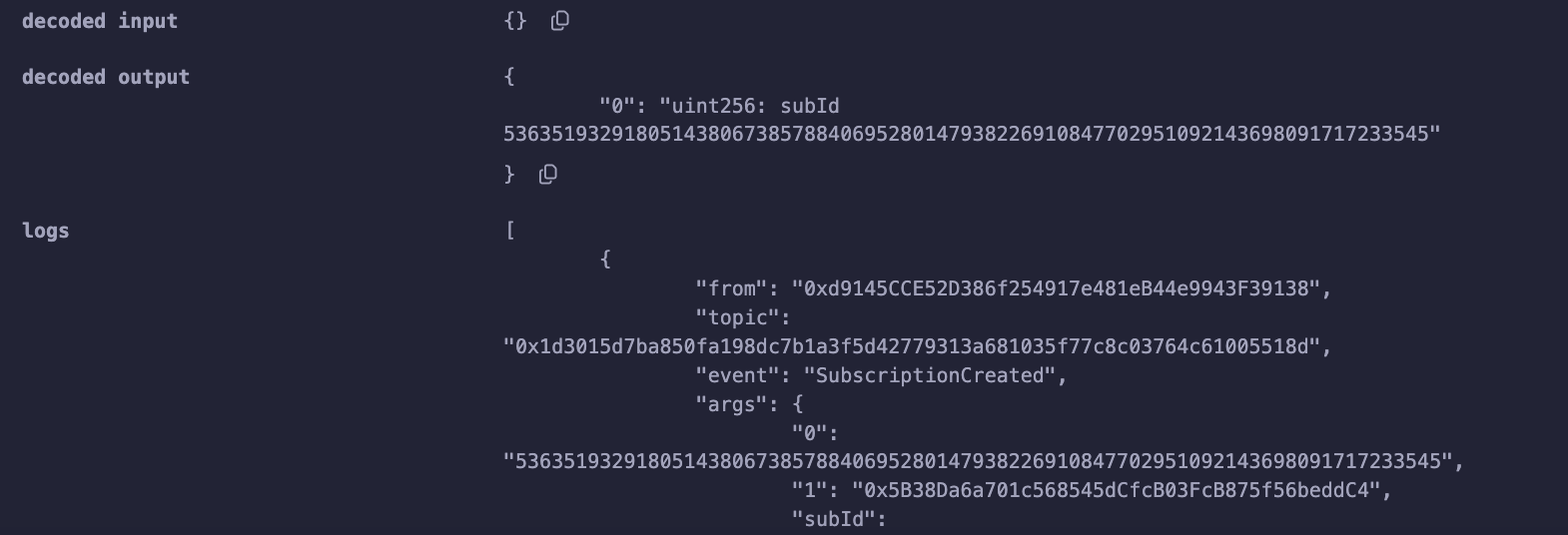 2. In the Remix IDE console, read your transaction decoded output to find the subscription ID. Note the subscription ID, which is required for multiple steps in this tutorial.