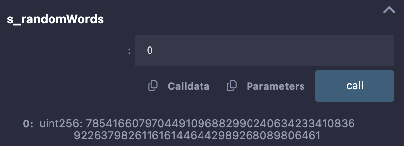 2. For each VRF request, your consumer contract requests two random words. After a request is fulfilled, the two random words are stored in the s_randomWords array. You can check the stored random words by reading the two first indexes of the s_randomWords array. To do so, click the s_randomWords function and: